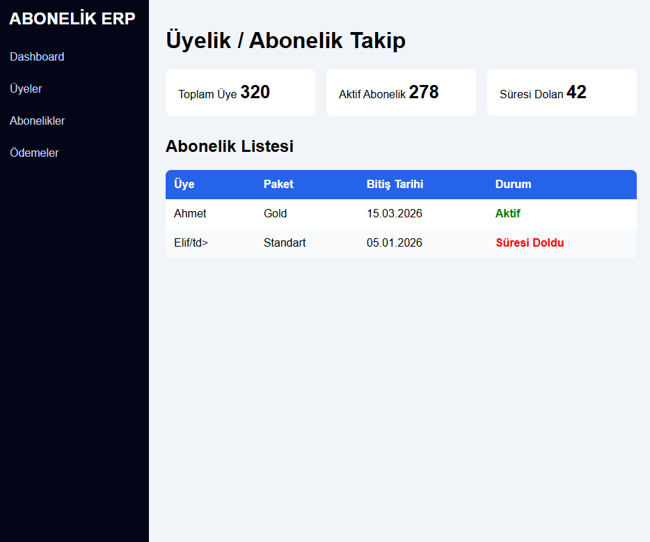 Üyelik başlangıç ve bitiş tarihleri, ödeme periyotları ve durum bilgileri tek merkezden izlenir. Böylece müşteri kaybı ve gelir kaçakları önlenir.